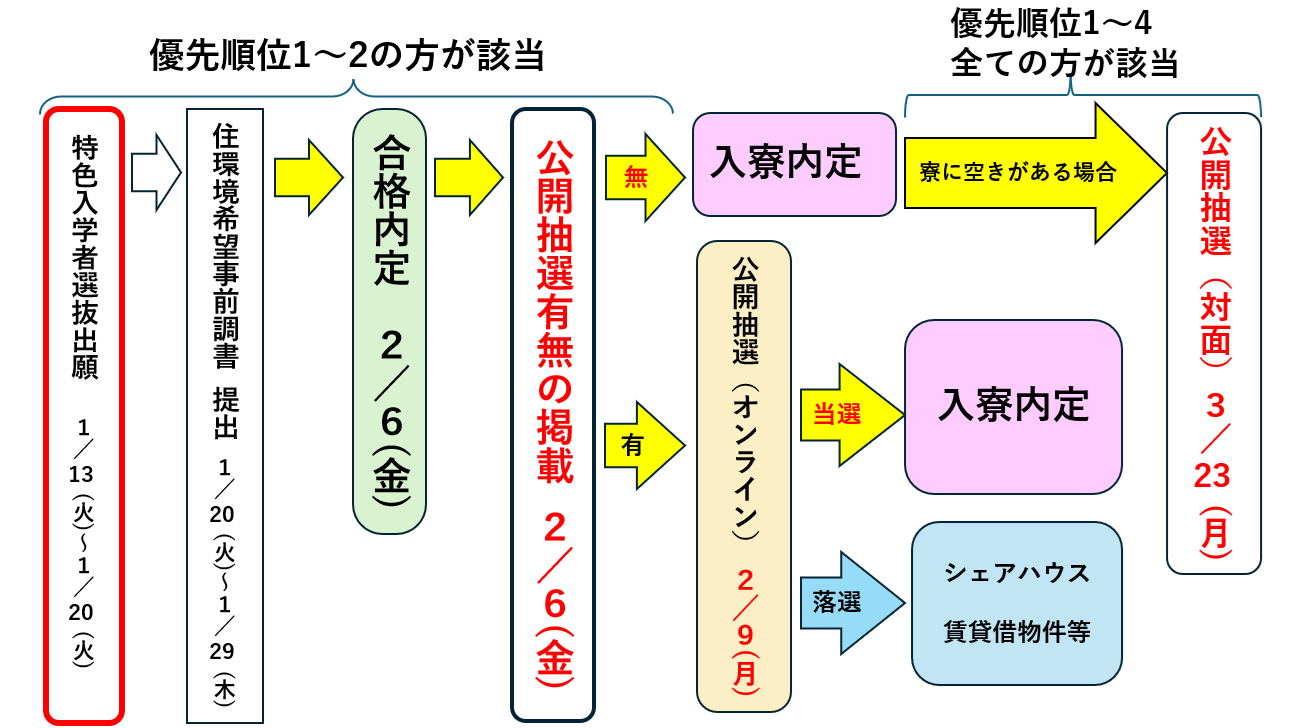 特色入学者選抜後に公開抽選を行う必要がなく、寮に空きがある場合は、1~4全ての方が対象で合格者招集日(3月23日(月曜日))に対面での公開抽選を行いますのでご参集ください。